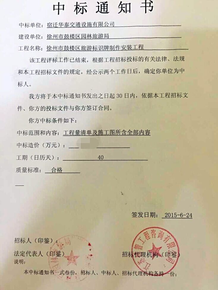 喜贺华泰交通中标-徐州旅游标识牌制作安装工程